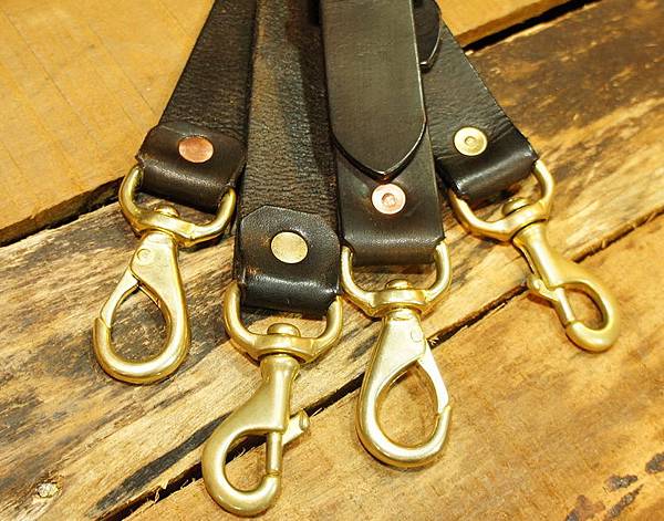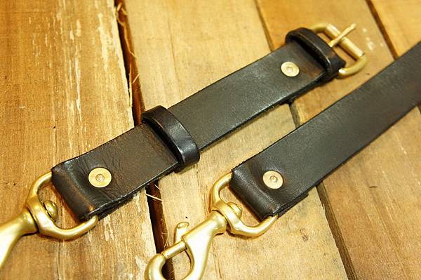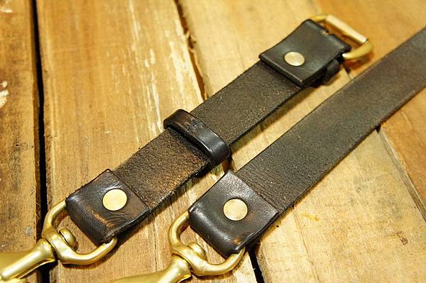 將原色牛皮手上色至深咖啡,並採用極為堅固而充滿古味的截斷式鉚釘